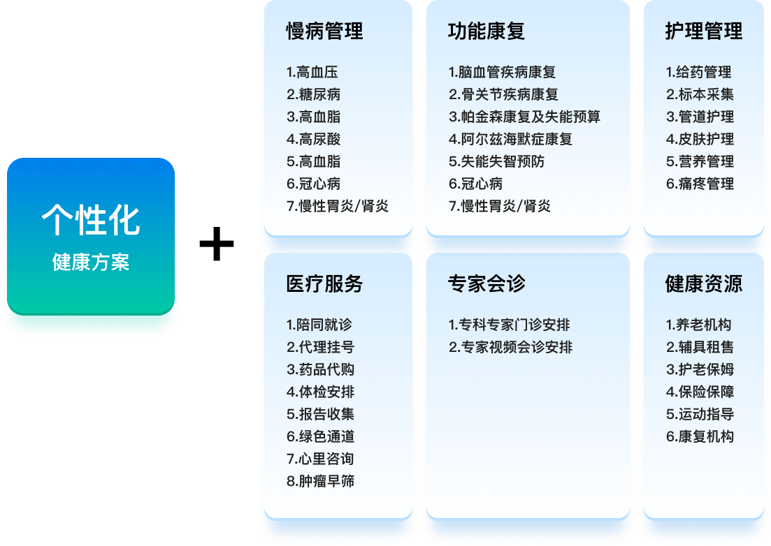 以智慧养老IOT中台为支持,链接专业医疗服务资源,为老人提供持续的慢病跟着管理服务。