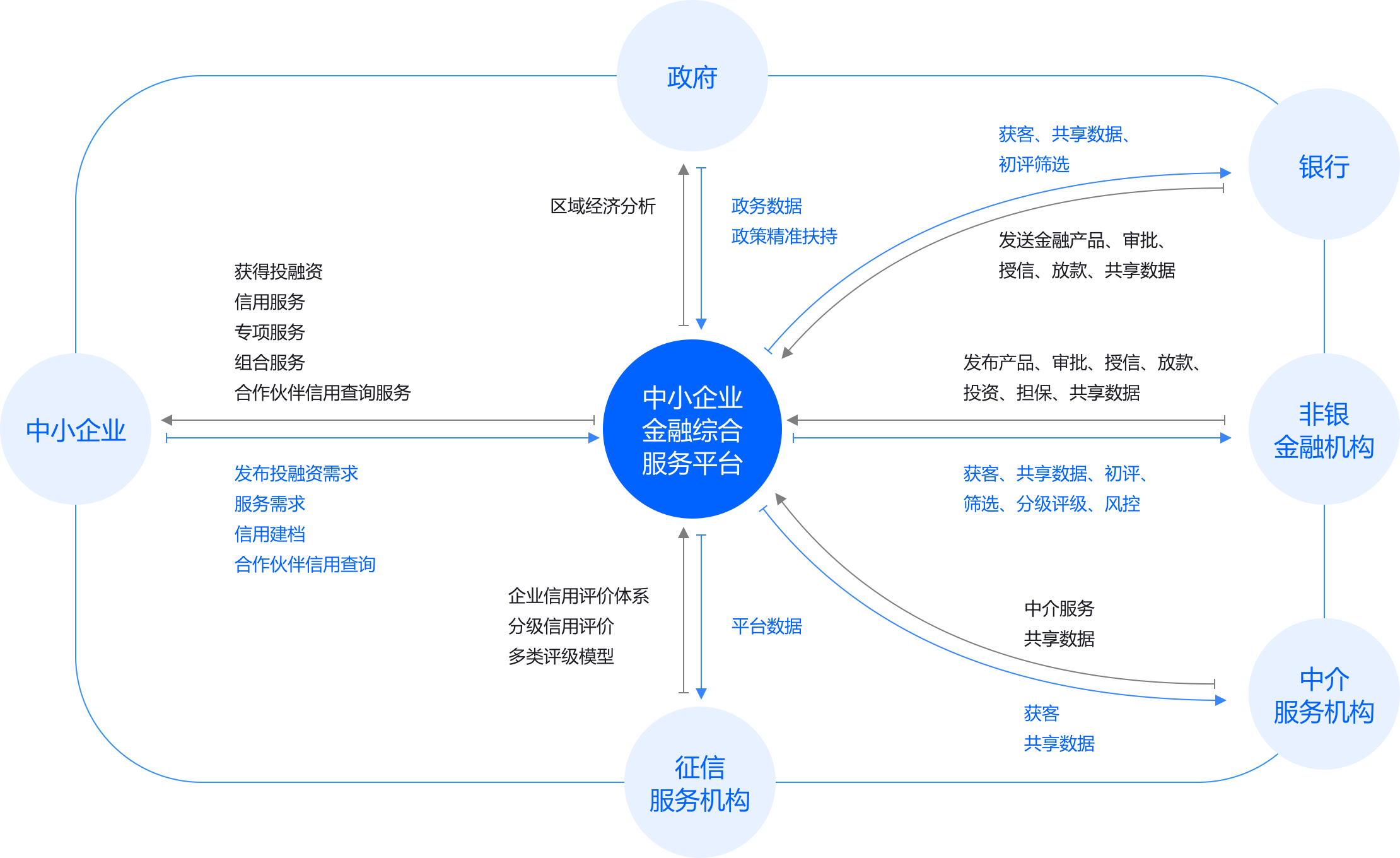 整合政府对中小微企业的扶持政策、企业公共信用信息、企业融资需求、金融机构融资产品等资源,覆盖各省市中小微企业,实现融资供需对接和一站式综合金融服务。